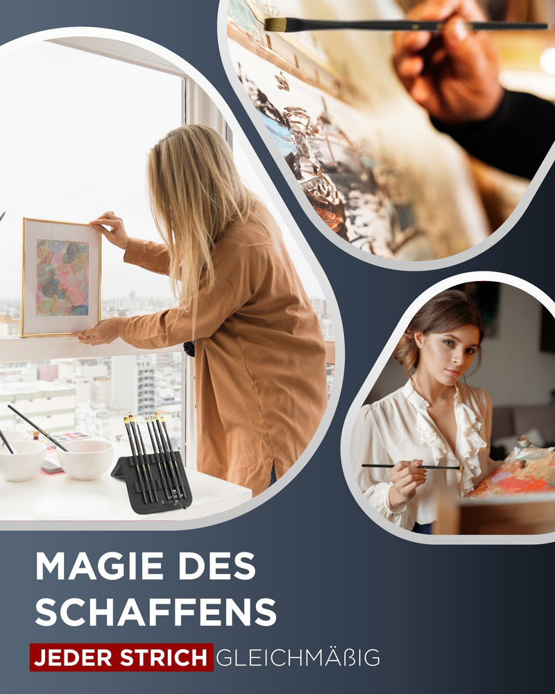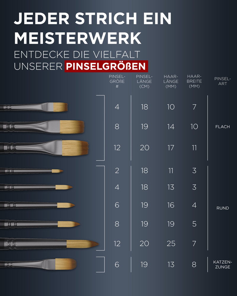 - Set-Inhalt: 9 Acrylpinsel (Rund 2 | 4 | 6 | 8 | 12 · Flach 4 | 8 | 12 · Filbert 6)
