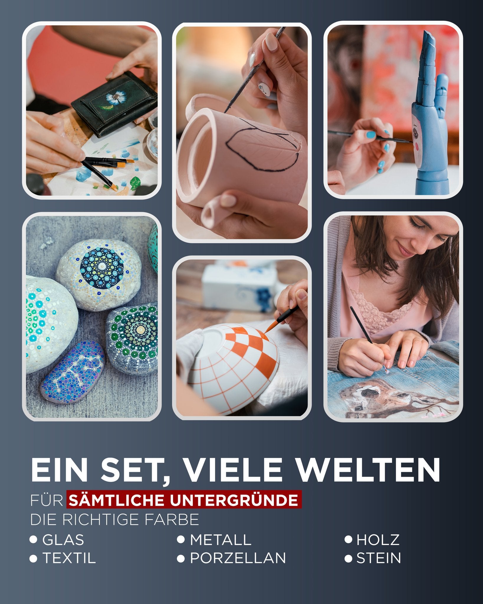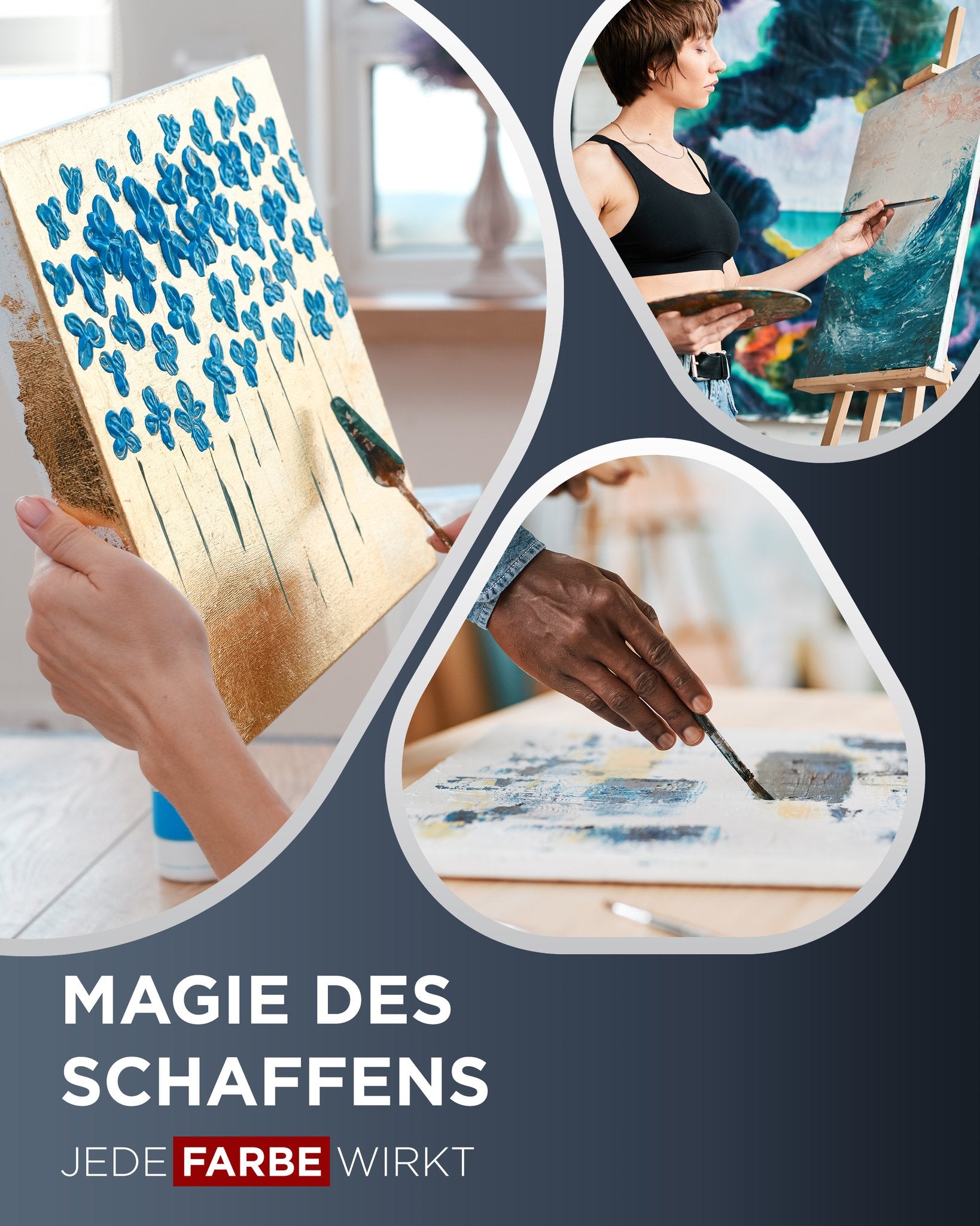 - Haftung: Leinwand, Papier, Gesso, Holz, Stein, Metall (grundiert), Glas & Textil
