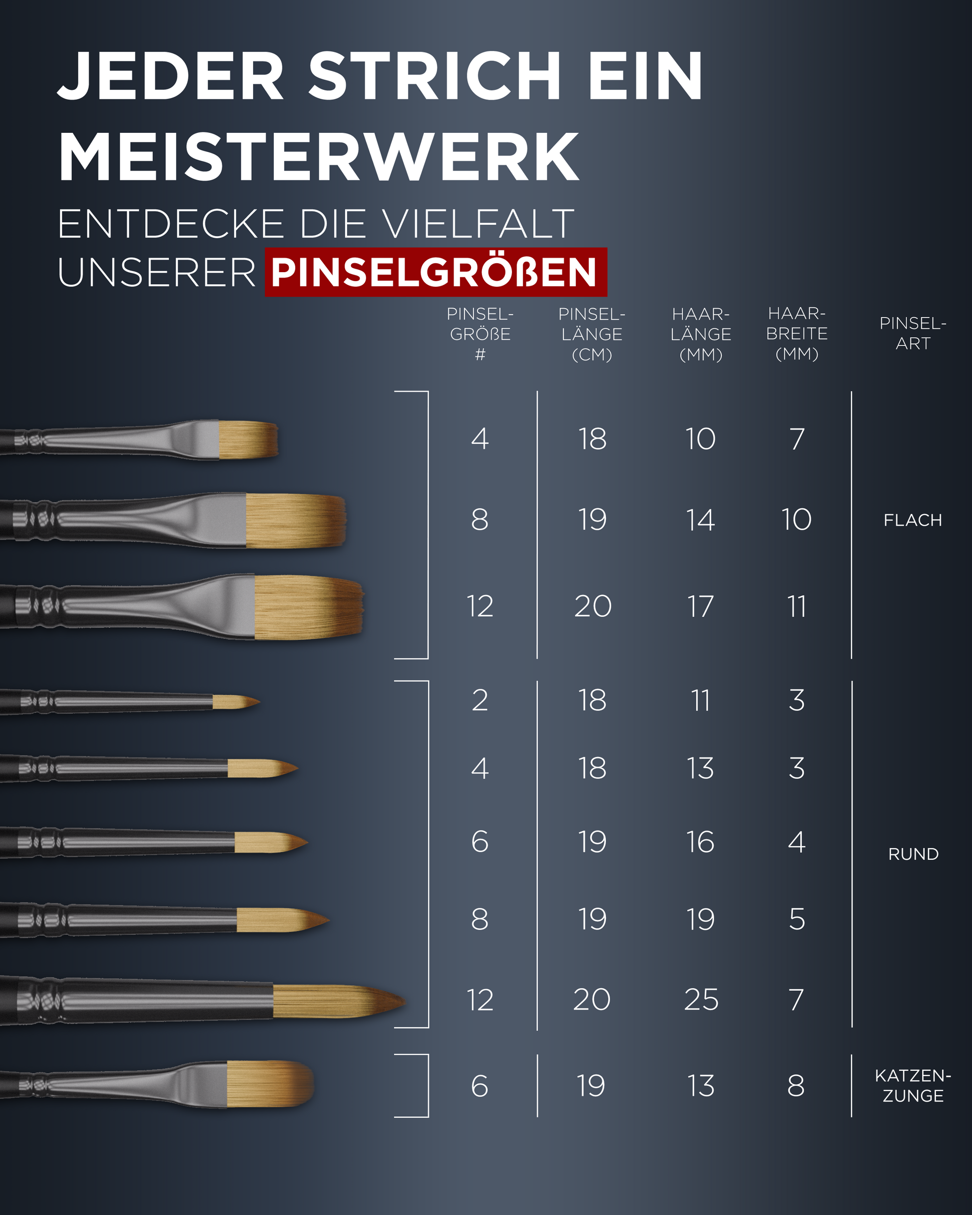 - PERFEKTE AUSWAHL – 9 präzise ausgewählte Pinselformen und Pinselgrößen für vielfältige Anwendungen. Ideale Pinselauswahl für jede Maltechnik und jedes Kunstprojekt – vom filigranen Strich bis zur breiten Fläche.